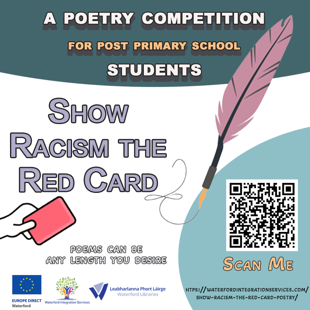 To celebrate and mark Waterford Anti-Racism Month and with the theme “Show Racism the Red Card” submit your original entry to waterfordantiracistmonth@gmail.com or drop it in/post to Waterford Libraries for the attention of Sinéad Cummins before the deadline of Friday 28th of February 2025 at 4pm.